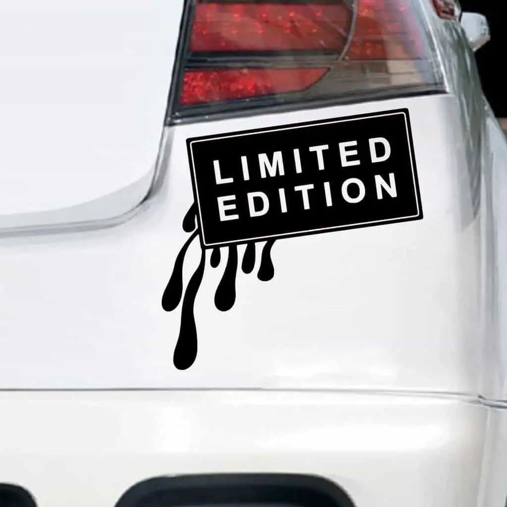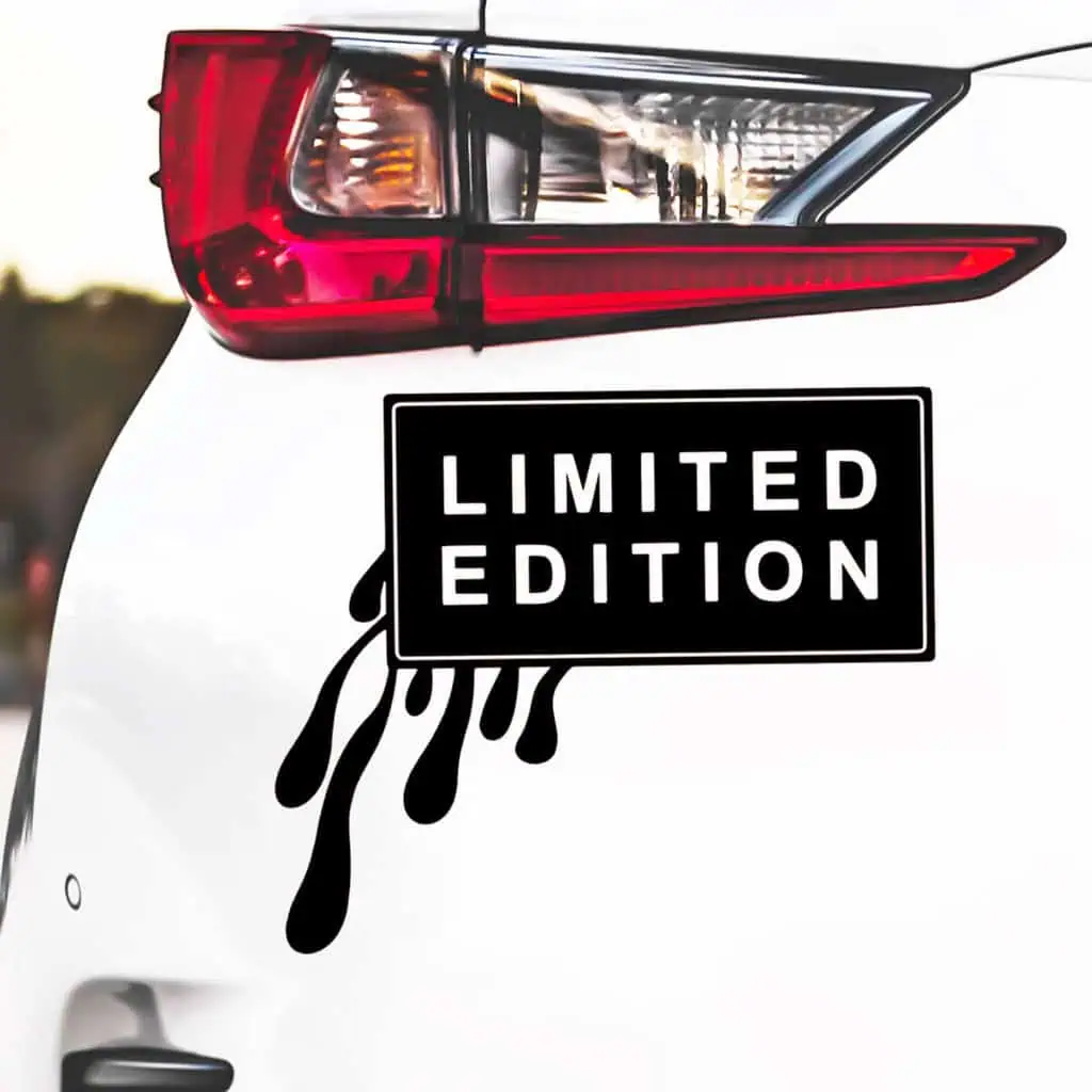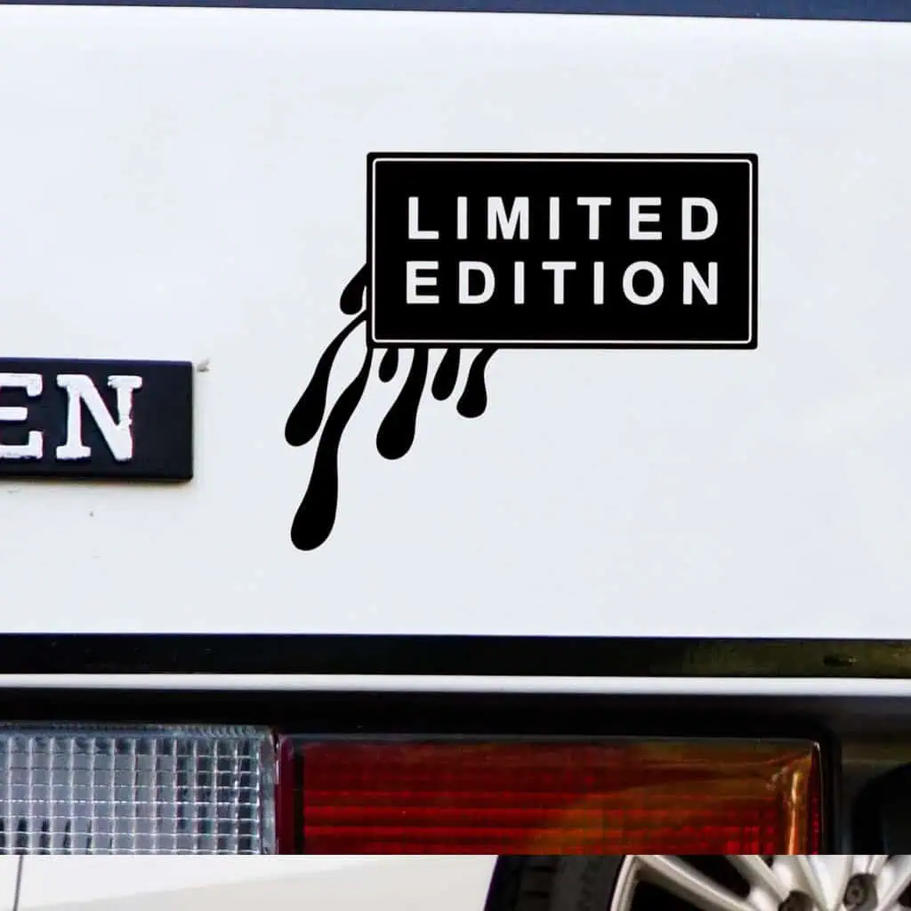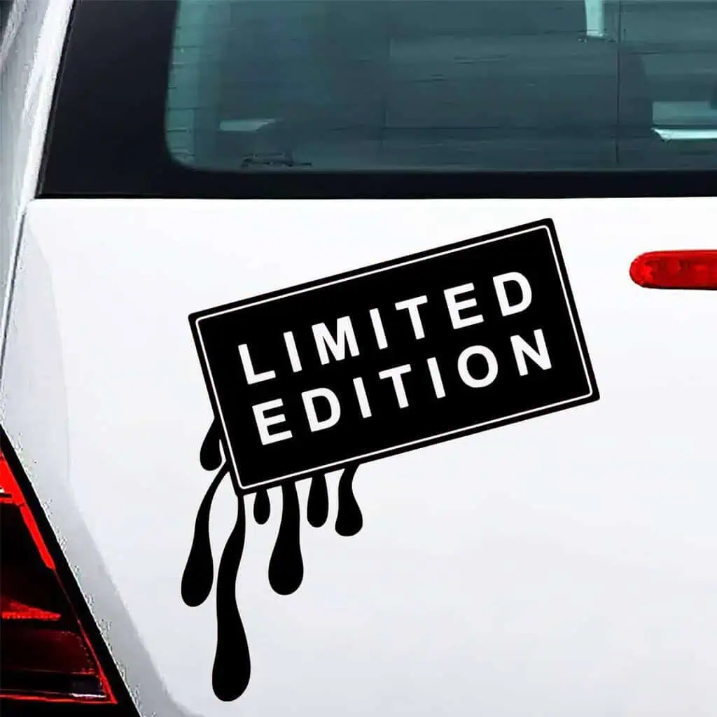 Avto nalepka Limited Edition z drzno in unikatno zasnovo, kjer se napis “Limited Edition” zdi, kot da se iz njega izliva tekočina, bo zagotovo pritegnila poglede in izstopala na cesti. Ta edinstven dizajn združuje minimalistično tipografijo z igrivo obliko, ki daje nalepki sodoben in svež videz. Idealna je za vse, ki želijo svojemu vozilu dodati nekaj posebnega in se ločiti od množice.