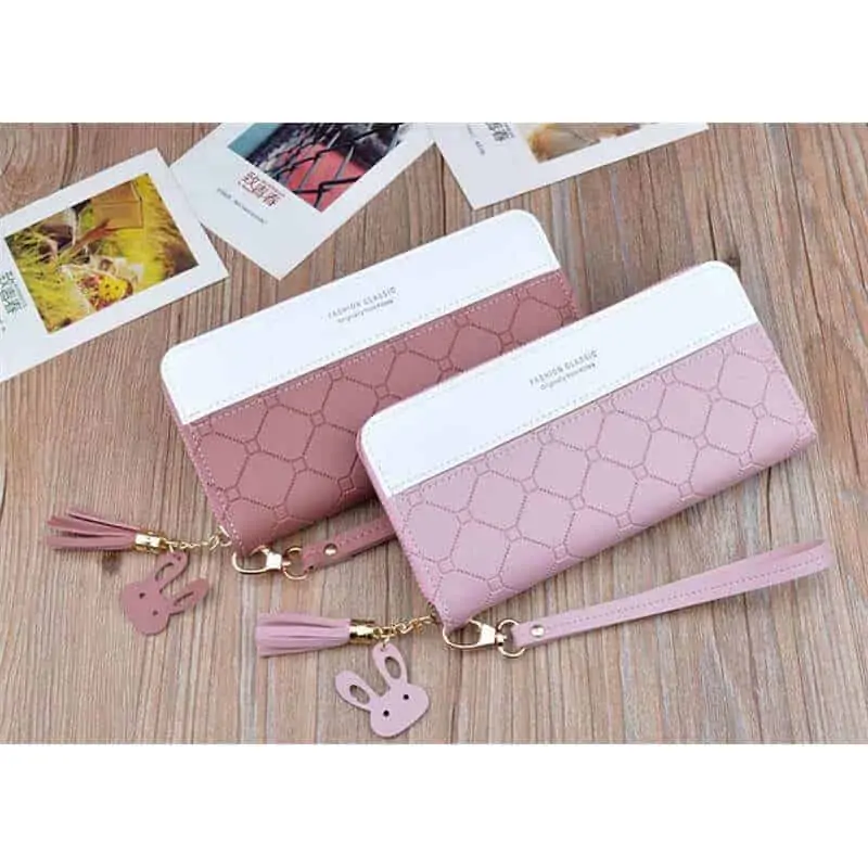 Dolga ženska denarnica v prelepih barvah in obliki, bo navdušila vse ženske. Usnjeni materiali oblikovani v modernih smernicah. Dodan usnjen ročaj in prelep obesek zajčka.