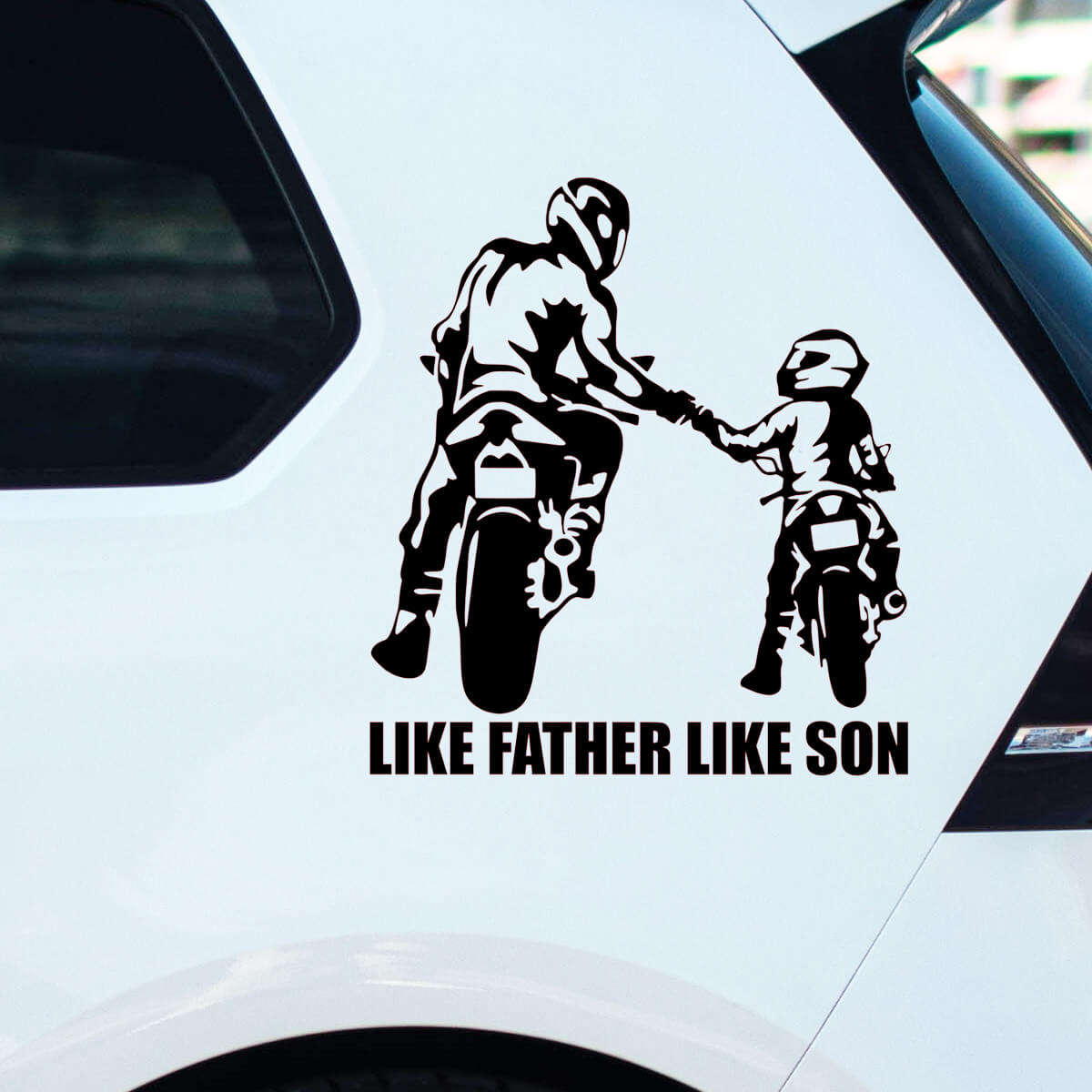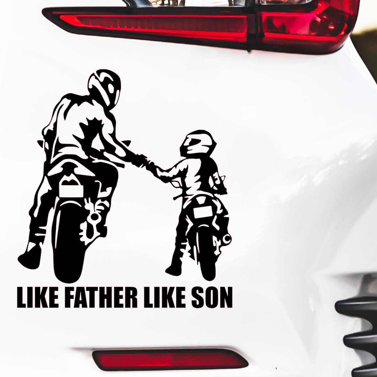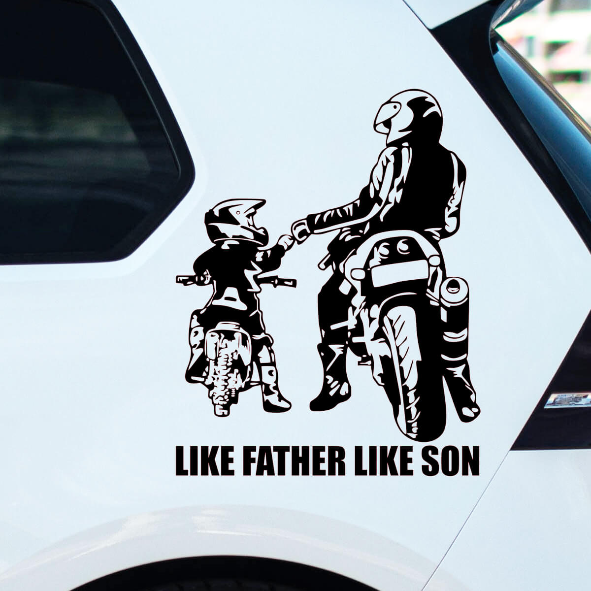 Las pegatinas de automóviles de motociclistas «LIKE FATHER LIKE SON» simbolizan el vínculo ininterrumpido y la pasión compartida por el automovilismo entre padre e hijo, representando una tradición y herencia únicas que se transmiten a través de generaciones familiares. Estas pegatinas son más que una simple decoración; son un reconocimiento al profundo sentido de pertenencia y a los momentos compartidos que forman recuerdos inolvidables. Con un diseño que combina elegancia y simbolismo, estas pegatinas expresan de manera sutil pero poderosa el amor por el estilo de vida motociclista y la importancia de los lazos familiares en este mundo.