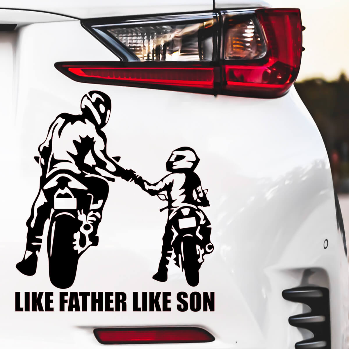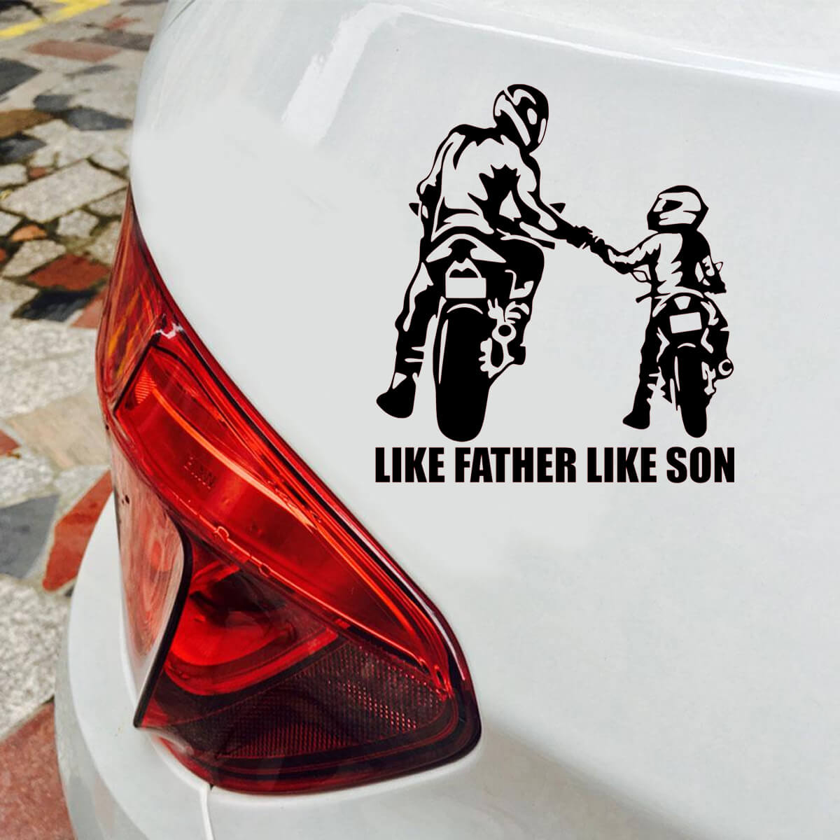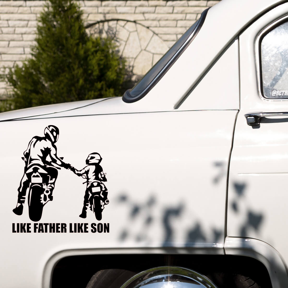 Las pegatinas de automóviles de motociclistas «LIKE FATHER LIKE SON» simbolizan el vínculo ininterrumpido y la pasión compartida por el automovilismo entre padre e hijo, representando una tradición y herencia únicas que se transmiten a través de generaciones familiares. Estas pegatinas son más que una simple decoración; son un reconocimiento al profundo sentido de pertenencia y a los momentos compartidos que forman recuerdos inolvidables. Con un diseño que combina elegancia y simbolismo, estas pegatinas expresan de manera sutil pero poderosa el amor por el estilo de vida motociclista y la importancia de los lazos familiares en este mundo.