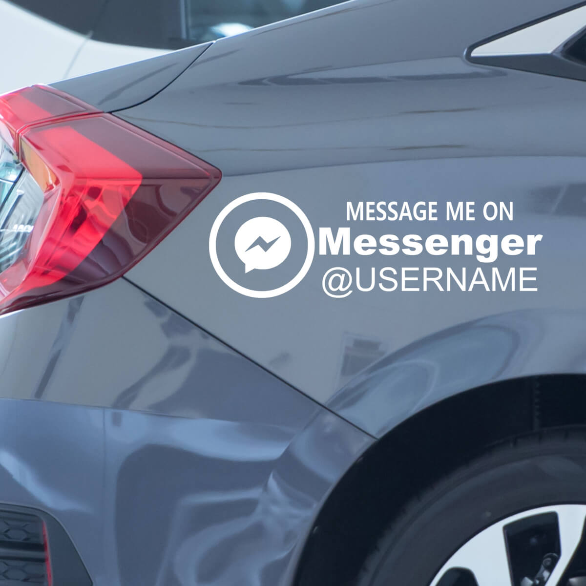 Facebook nalepka Message me on messenger je super izbira, če želiš, da ti ljudje hitro pišejo prek Messengerja. Na nalepki je velik Messenger znak v krogu, poleg pa jasno besedilo MESSAGE ME ON Messenger in spodaj vrstica z @USERNAME, kjer dodaš svoje ime.
