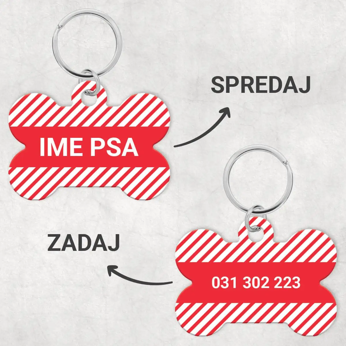 Privjesak za psa s prekrasnim slikanjem ravno crtama i personaliziranim imenom sprijeda te telefonskim brojem straga.