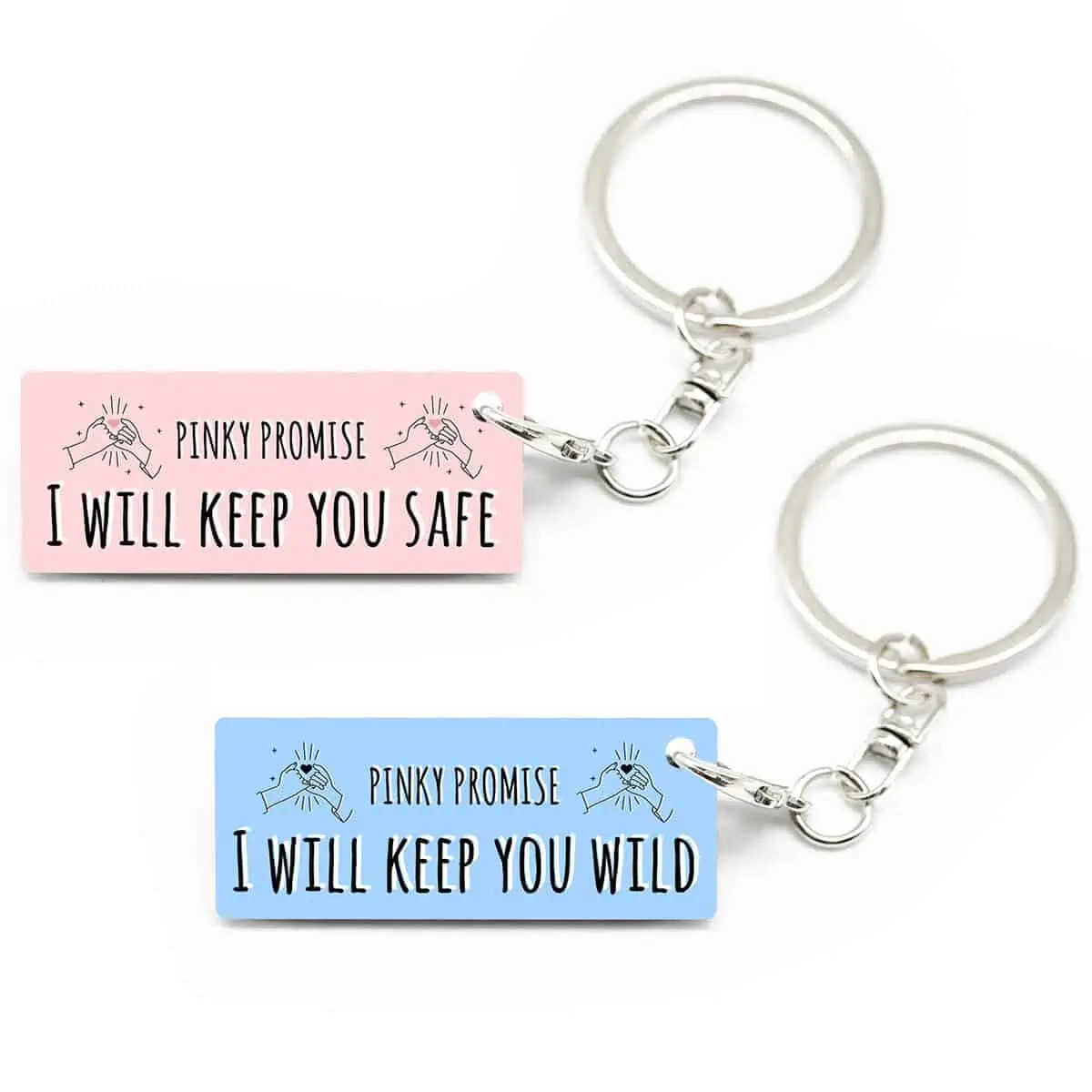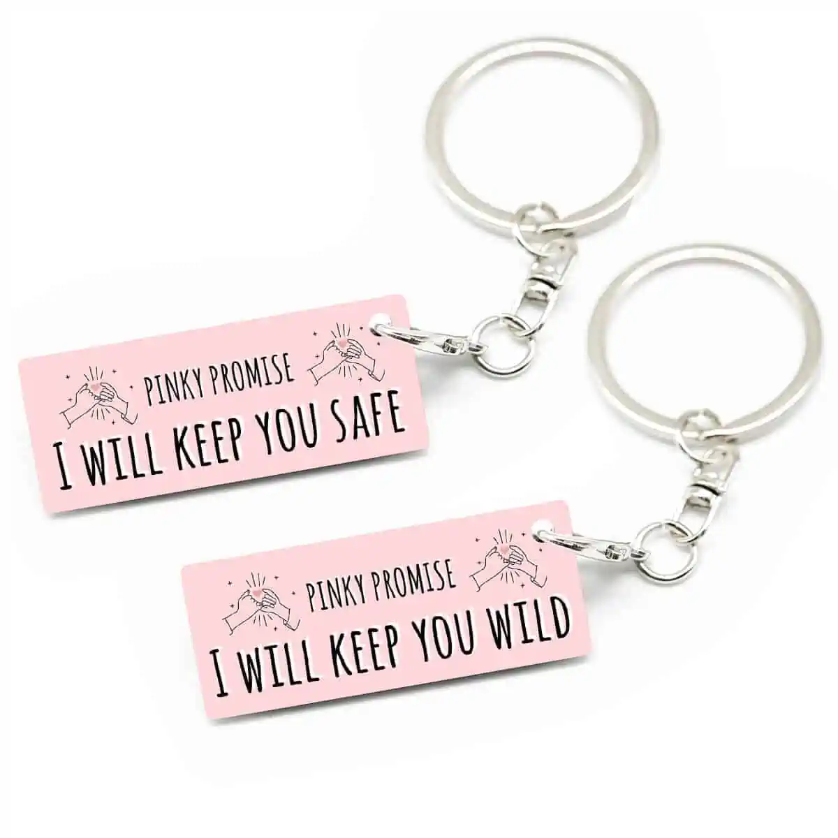 Privjesci za ključeve “pinky promise” su posebno dizajnirani privjesci za ključeve za parove koji imaju značenje prijateljstva i obećanja. Ovi privjesci su obično izrađeni od metala.