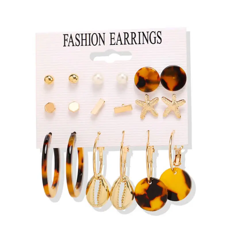 Komplet uhanov z morskimi vzorci vsebuje prekrasne vtične uhane v obliki zvezdic, krogov, pravokotnika in šestkotnika zlate barve ter prekrasne okrogle vtične uhane v obliki belega bisera.