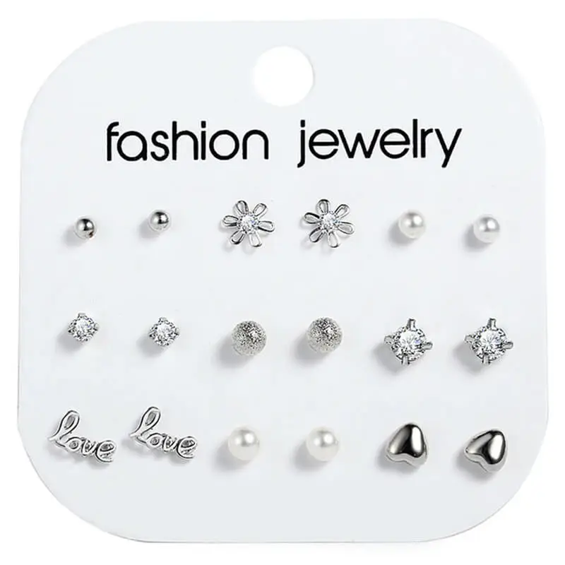 Komplet vtičnih uhanov vsebuje tudi majhne okrogle uhane, ki so srebrne barve, uhane v obliki biserov in uhane z bleščečimi diamantki.