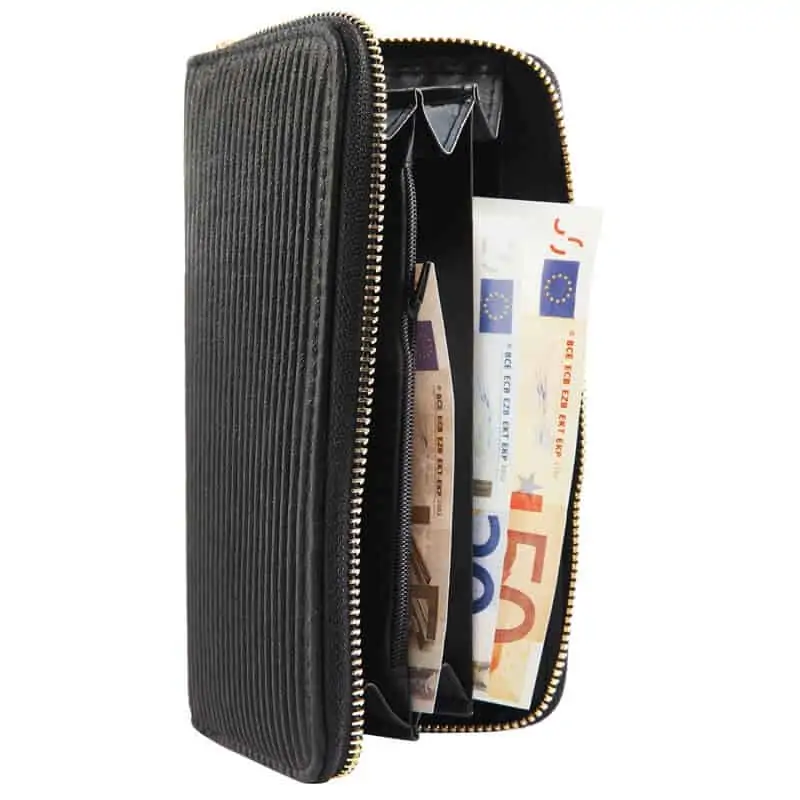 Modna ženska denarnica je prekrasne črne barve z prekrasno in močno zadrgo, ki je prekrasne zlate barve.