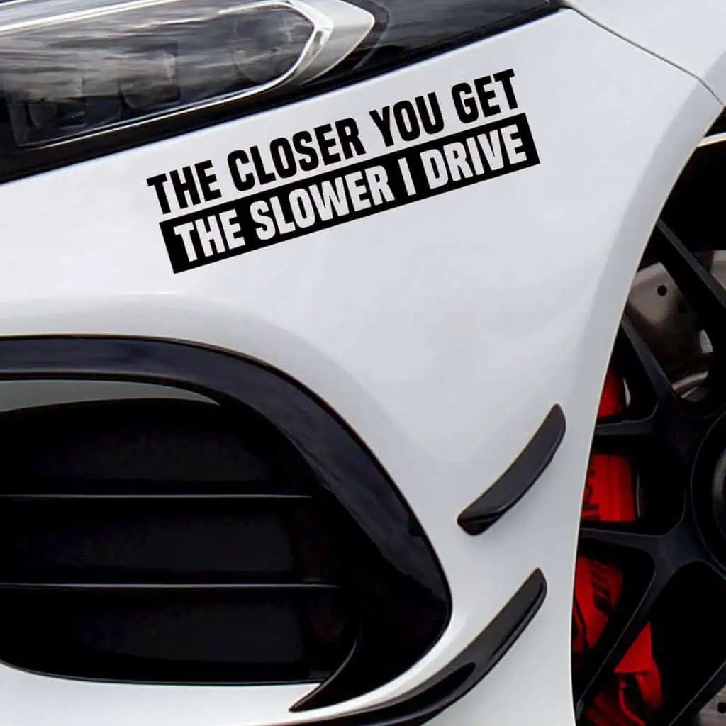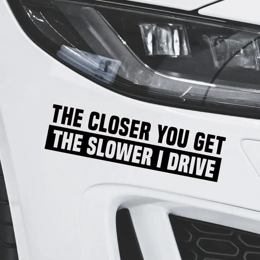 Nalepka Closer you get the slower I drive je duhovit in subtilen način, kako vozniki lahko komunicirajo z drugimi udeleženci v prometu. Ta avto nalepka na igriv način opozarja zadaj vozeče, da bo preblizu sledenje povzročilo počasnejšo vožnjo. Je odličen opomnik za ohranjanje varne razdalje med vozili, obenem pa dodaja pridih humorja vsakodnevnim vožnjam. Z njenim jasnim in neposrednim sporočilom, ta nalepka ne samo izboljšuje varnost na cestah, ampak služi tudi kot izraz osebnosti voznika.