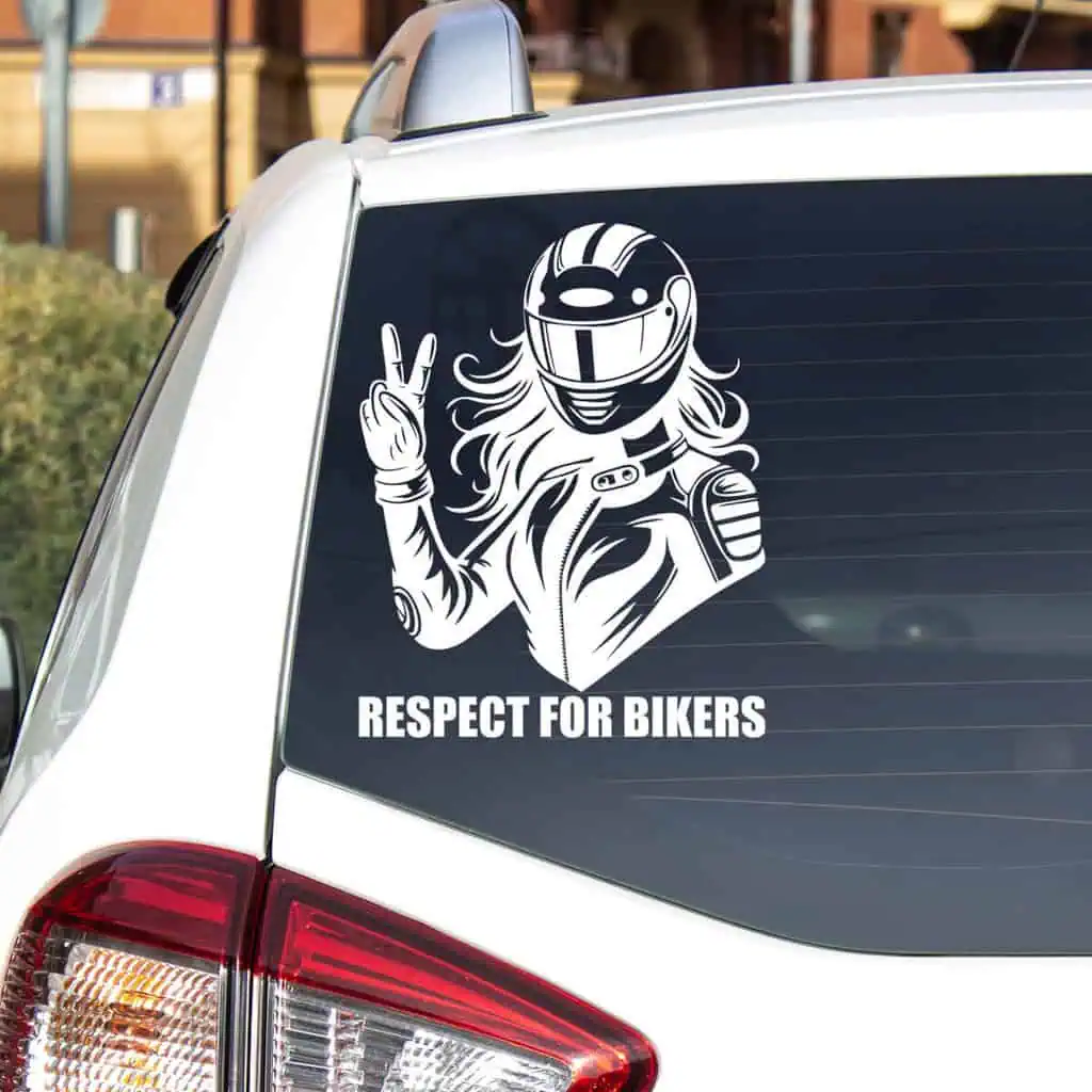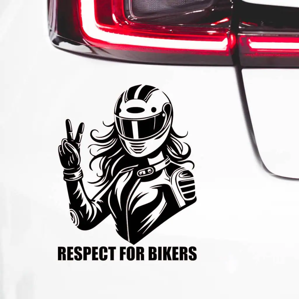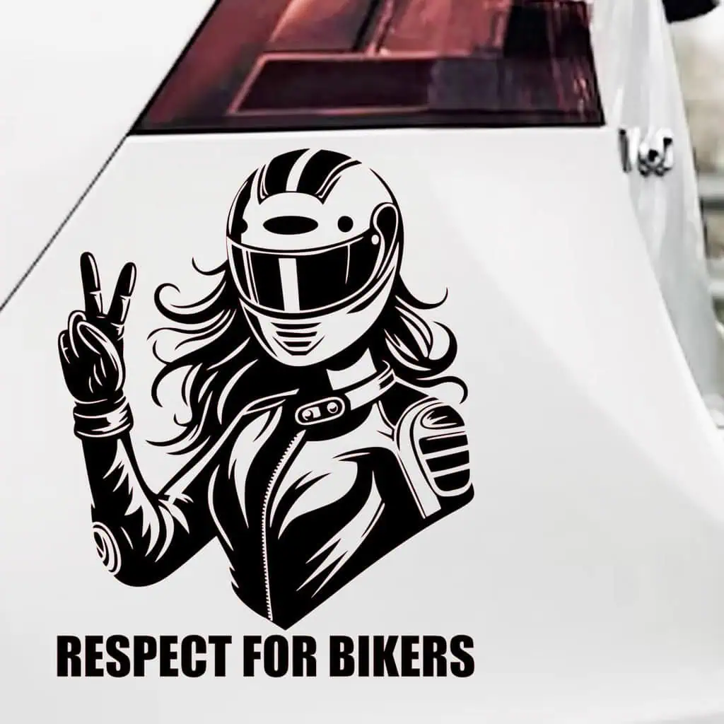 Nalepka za avto MOTORISTKA, kjer je od pasu navzgor poslikana prekrasna ženska v motoristični opremi, ki s kretnjo roke prikazuje znak miru (peace), simbolizira “Respect for Bikers” in je namenjena kot poklon vsem motoristkam. Ta umetniško dovršena nalepka ne samo da izraža moč in neodvisnost žensk, ki se podajajo na ceste z motorji, ampak tudi spodbuja spoštovanje in solidarnost med vsemi motoristi. Prikaz ženske v motoristični opremi odraža odločnost, pogum in eleganco, hkrati pa pošilja sporočilo enakosti in podpore v motoristični skupnosti.