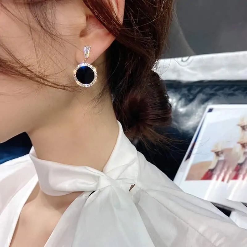 Okrogli modni uhani posuti s prelepimi diamanti in lepim črnim krogom. Z njimi boste hitro opozorile nase in postale središče pozornosti.