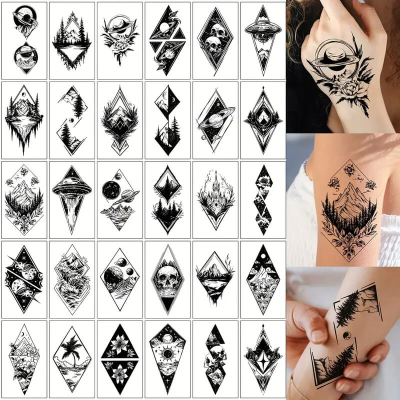 Kolekcija teh začasnih tatujev je popoln prikaz raziskovanja in mistike, saj združuje elemente narave, vesolja in geometrijskih vzorcev. Vsaka tetovaža izraža globoko povezanost z neznanim, spominja na moč narave ter na neskončno skrivnostnost vesolja. S čistimi linijami in prefinjeno simetrijo te tetovaže predstavljajo ravnovesje med realnostjo in sanjami.
