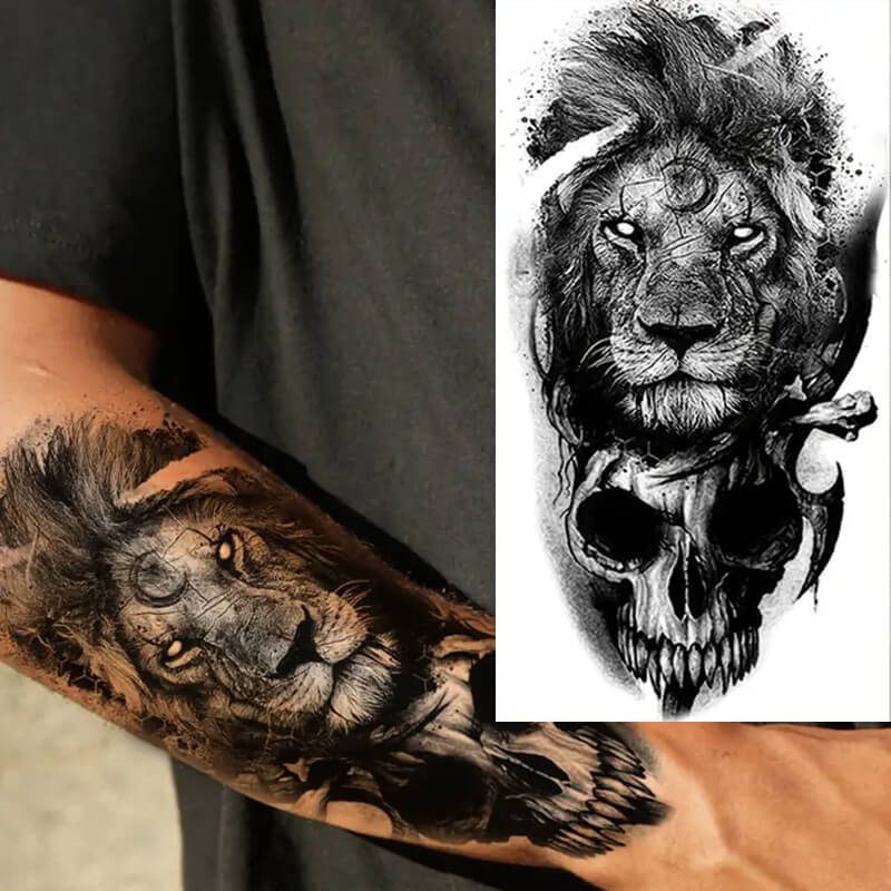 Tattoo nalepka lev in lobanja preživetje, soočenje, moč