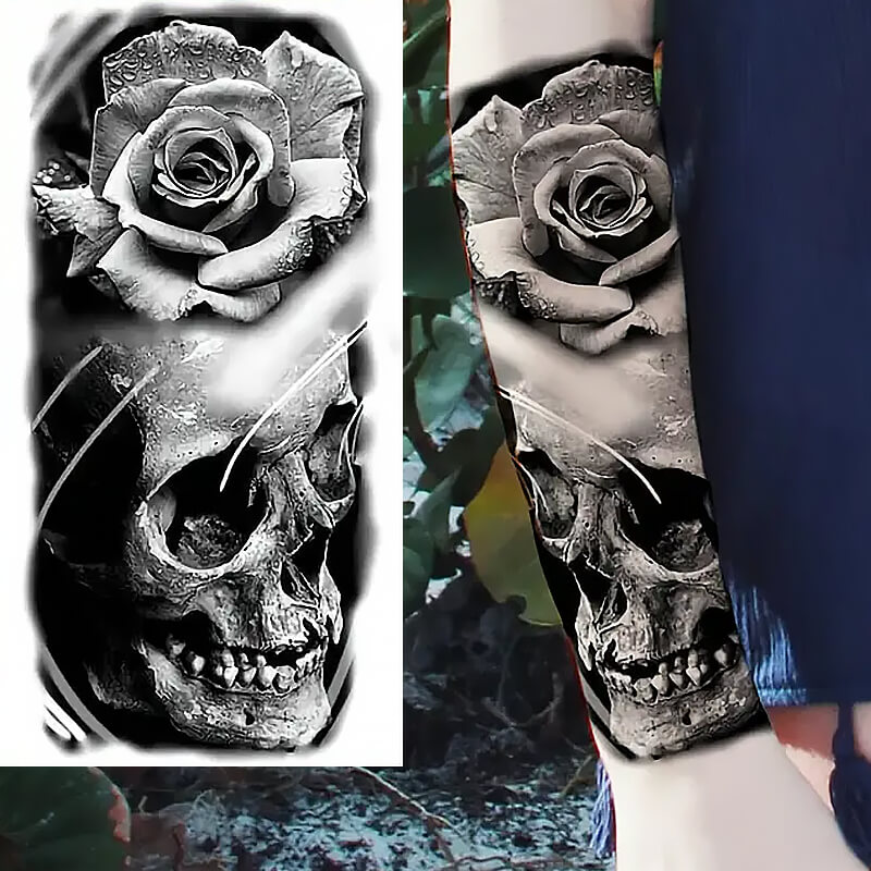 Iz teme se dviga vrtnica, posuta z roso spominov, ki jo podpira lobanja – neizbežni simbol minljivosti. Njeni zobje se krčevito držijo preteklosti, medtem ko cvet nad njo razkriva lepoto sedanjega trenutka. Ta tetovaža je močno vizualno sporočilo o ravnovesju med življenjem in smrtjo, med ljubeznijo in propadom.