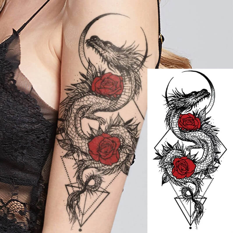 Divja energija zmaja in zapeljiva eleganca rdečih vrtnic ustvarjata tetovažo, ki izraža popolno ravnovesje med surovo močjo in prefinjenostjo. Zmaj, simbol neuničljive sile in modrosti, se elegantno ovija okoli vrtnic, ki v vsej svoji lepoti skrivajo globoko simboliko ljubezni, strasti in preizkušenj. Geometrijski elementi v ozadju dodajajo mističen pridih, kot da je ta podoba vklesana v usodo.