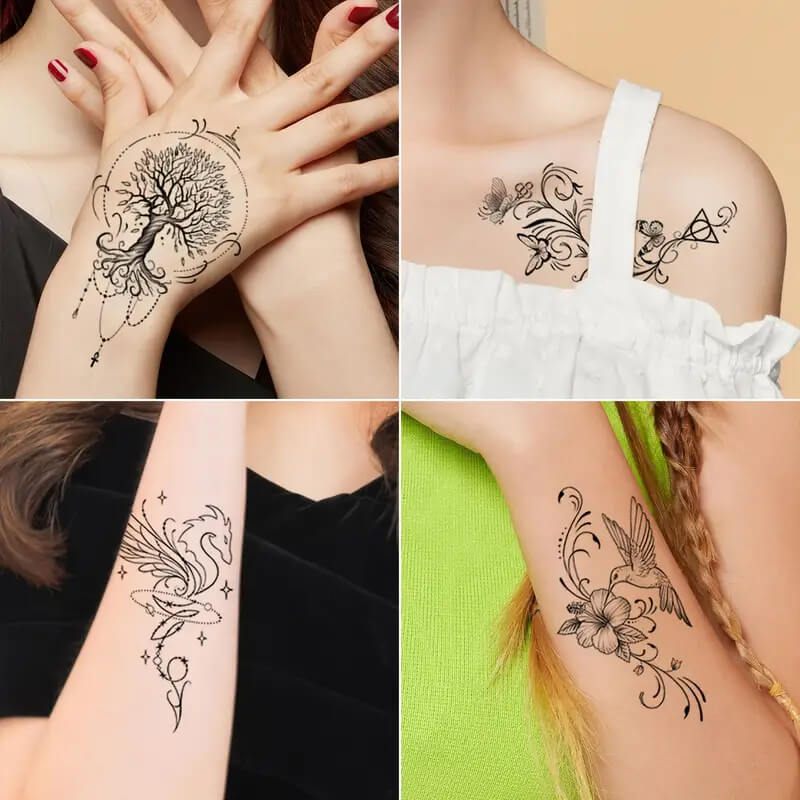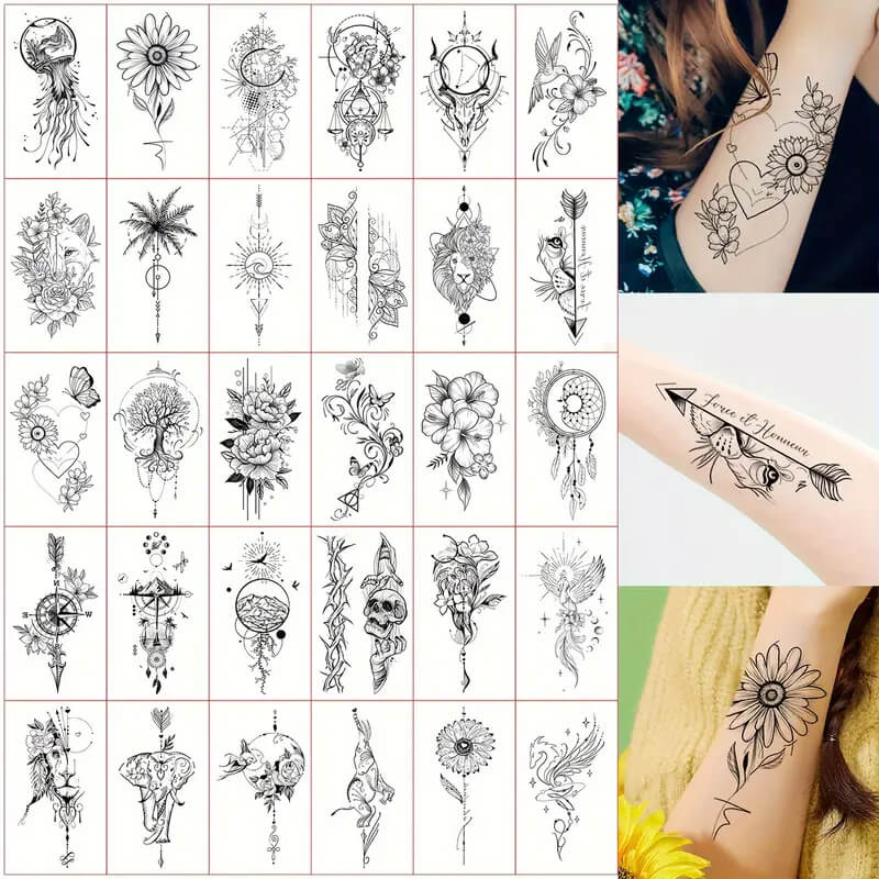 Ta čudovita kolekcija začasnih tetovaž združuje simbole narave, moči in elegance, ki te lahko navdihujejo vsak dan. S prepletom cvetlic, živali, simbolov in geometrijskih vzorcev vsaka tetovaža pripoveduje zgodbo o tvoji notranji moči, nežnosti in povezanosti z okoljem.