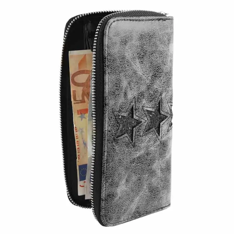 Ta prelepa ženska denarnica je prekrasne sivo črne barve in ima prekrasne bleščeče zvezde katere podarjajo modernost vsaki punci.