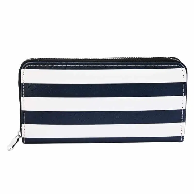 Ženska denarnica je prekrasne črtaste temno modre in bele barve in se bo zelo lepo vklopila v bele, črne in temno modre kombinacije.